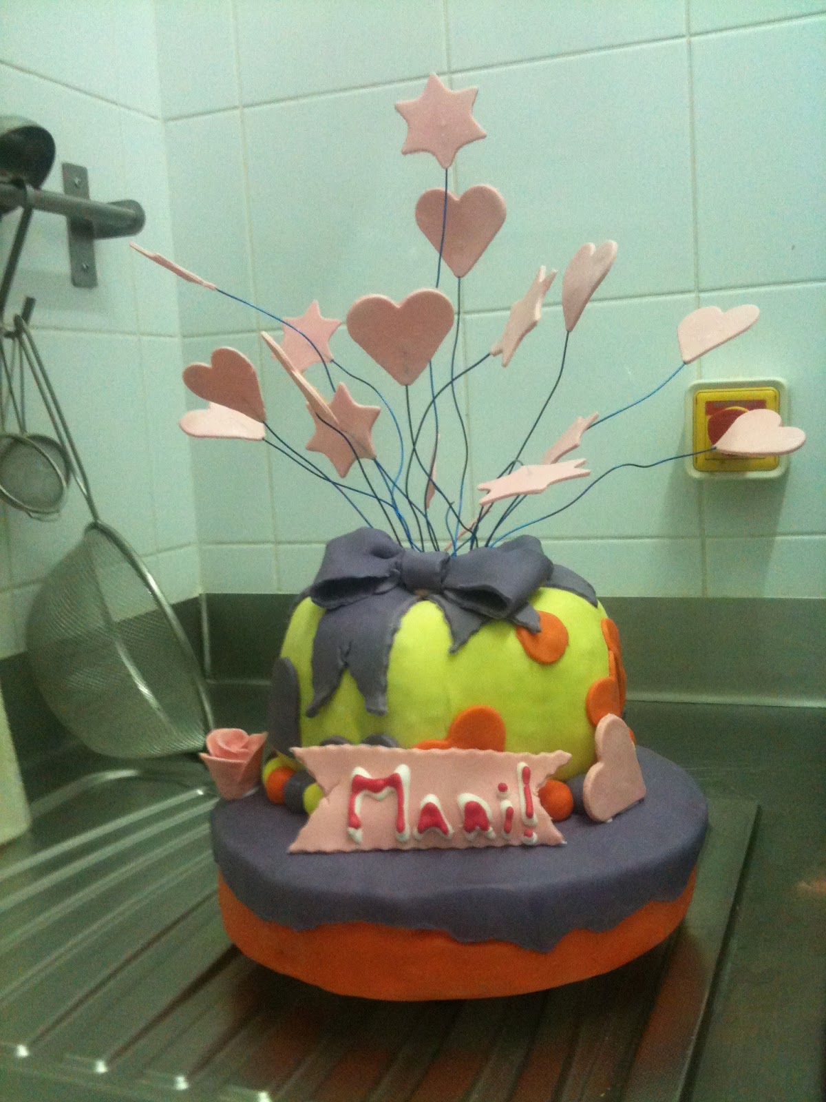 The place where the two cakes join is usually covered with a ribbon or with beads like here. Ho yea, sugar paste decorations will stick nicely just by wetting them with a bit of water. When the contact surface is small (such as for butterflies for example) one can use royal icing.... In the middle of the bunt cake I placed some almond paste to stick the wires with the stars and hearts. Here is a test.